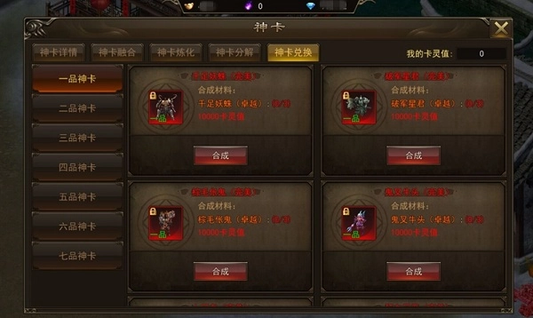 神卡不仅对应着相应的上古异兽,而且还有品级、品质的区别。3张相同的神卡还可以进一步融合成为更高品质的卡,但小心有一定失败率,会使卡牌回收成为卡灵值。当然,这个卡灵值也有它的作用,可以用来兑换完美品质的神卡。