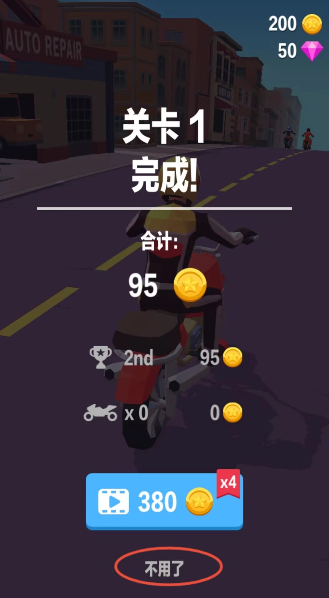 3、持续操控直至完成赛道,结算界面统计获得奖励与最终排名,提供直接返回主界面功能选项。